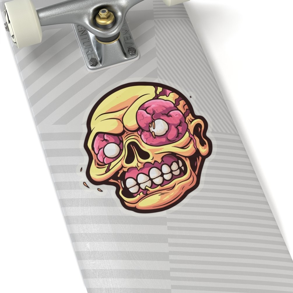 Descend into pure horror and chaos with "Infernal Decay", an intense and grotesque zombie skull digital artwork. This radioactive nightmare showcases an undead skull with half-exploded, oozing brains, melting flesh, and a skeletal grin that screams terror. The use of fiery yellows, bloody reds, and deep shadows creates a **high